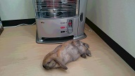 そのうさぎたん。ケージの扉を開けて自由にさせておくと、ストーブの前で寝そべって昼寝を始めます。