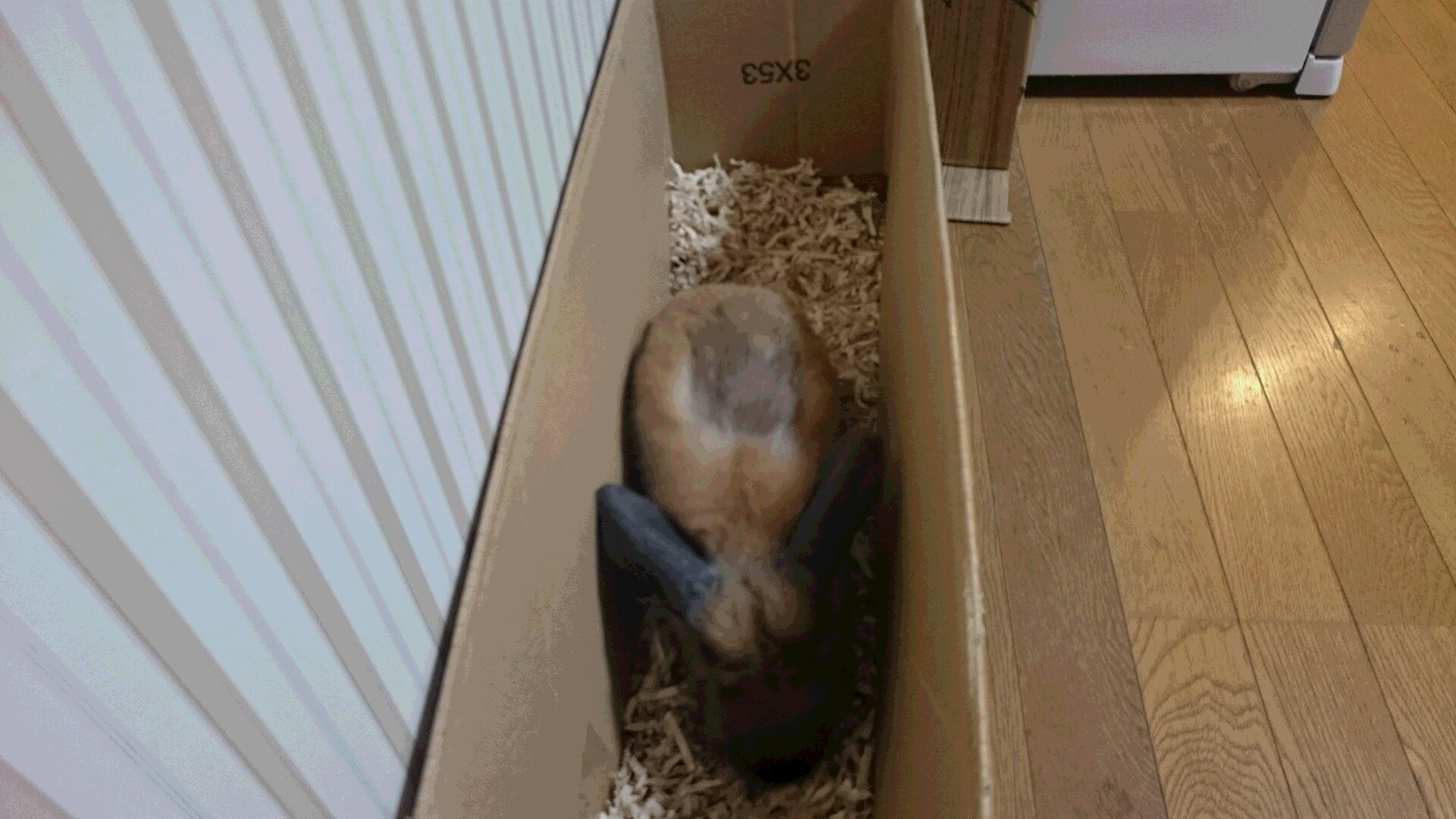 細かく裁断された紙を入れた段ボール箱に入って、土を掘るように前足でかいているところです。