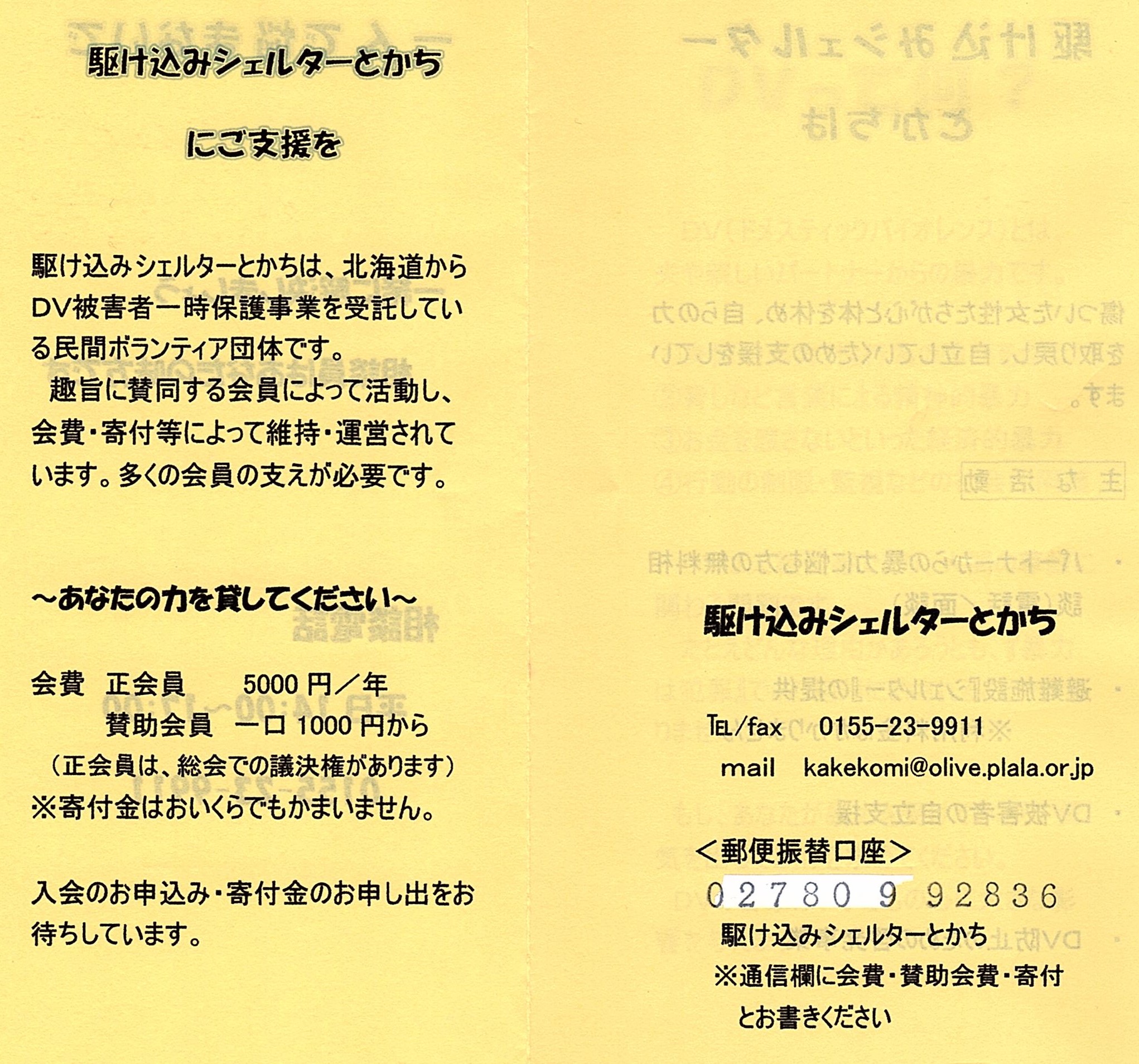 DV(ドメスティックバイオレンス;配偶者等からの暴力)の根絶と、被害者の立ち直りを支援する「駆け込みシェルターとかち」の運営が、財政難のため厳しい状況です。